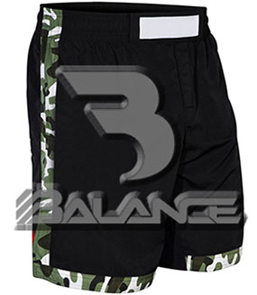 MMA combat fighting shorts trunks, camo border design with hook and loop velcro closure and drawstring. Shorts are made of 97% polyester and 3% spandex.