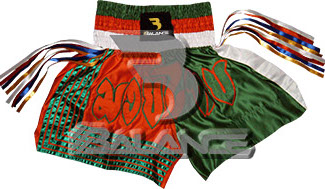 Muay Thai Ribbon Short with writing Style. Light weight strong durable and hard wearing satin material with wide elastic waist and cord waistband with wide leg rooms allowing the freedom of movement to execute speedy high kicks and knees.