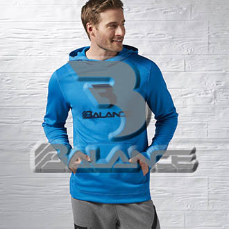 Men full sleeved warm pullover sweatshirt with cap. Hoodie is made of 100% polyester. Sweatshirt has one big common front pocket and big logo on front.