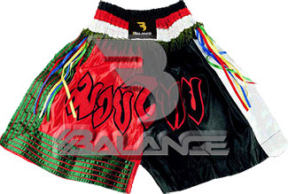 Muay Thai Ribbon Short with writing Style. Light weight strong durable and hard wearing satin material with wide elastic waist and cord waistband with wide leg rooms allowing the freedom of movement to execute speedy high kicks and knees.