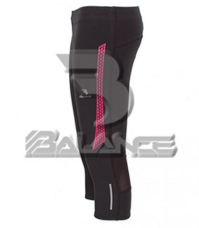 Women sports compression capri leggings made of best quality soft and strong polyester spandex. Used for fitness training, gym, yoga or running. Tech design on both sides with mesh panels.